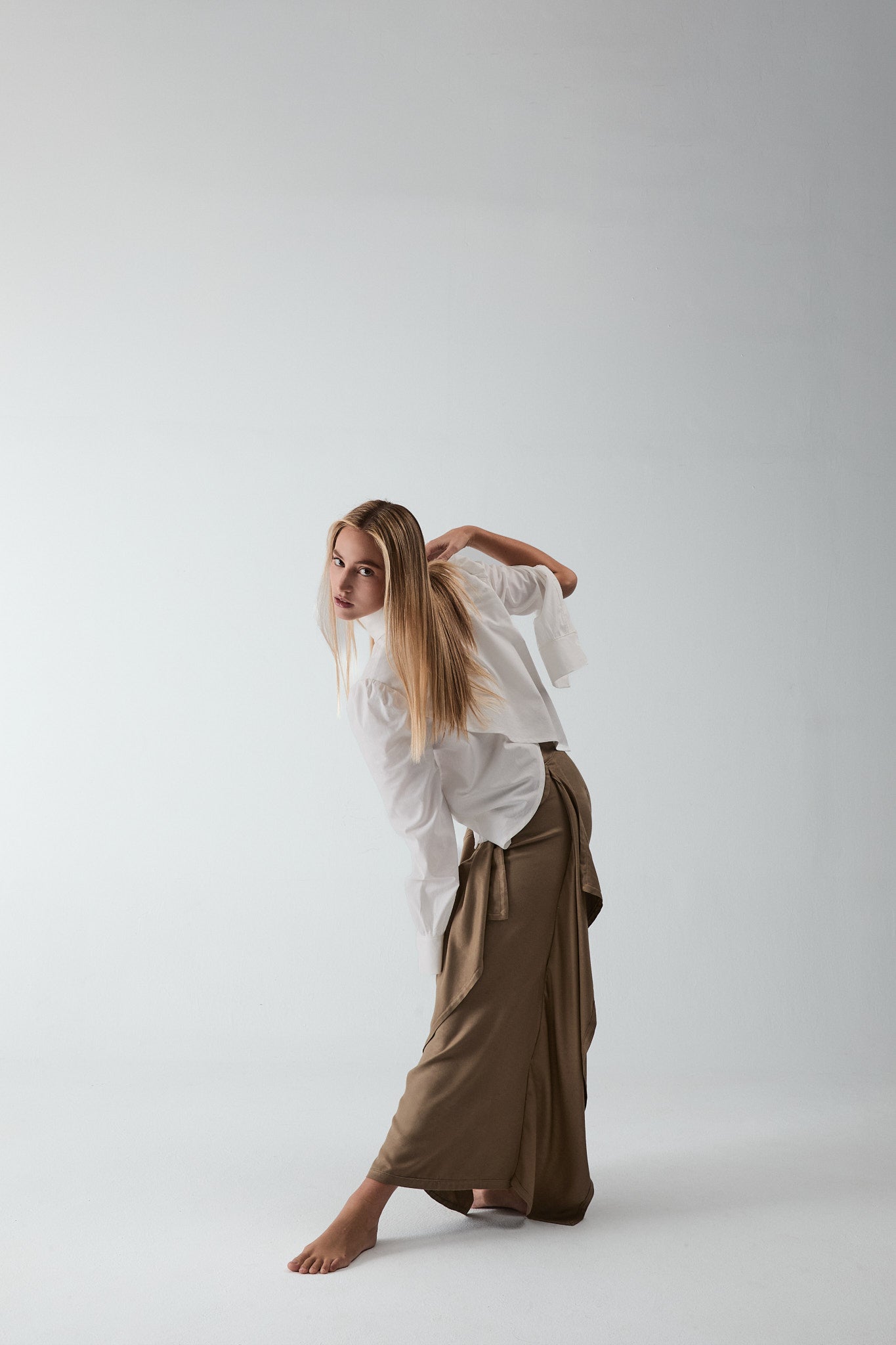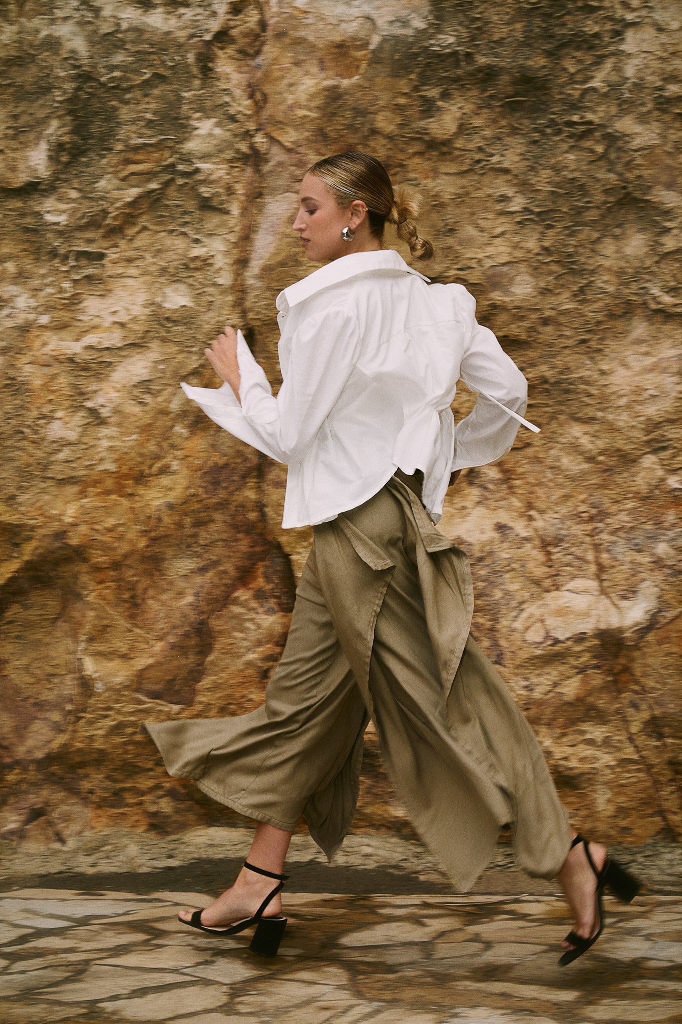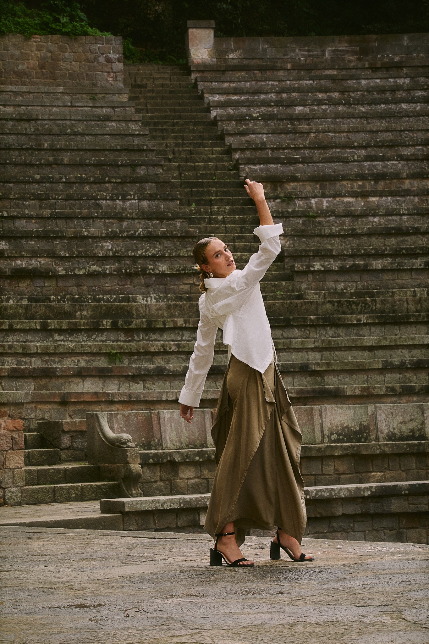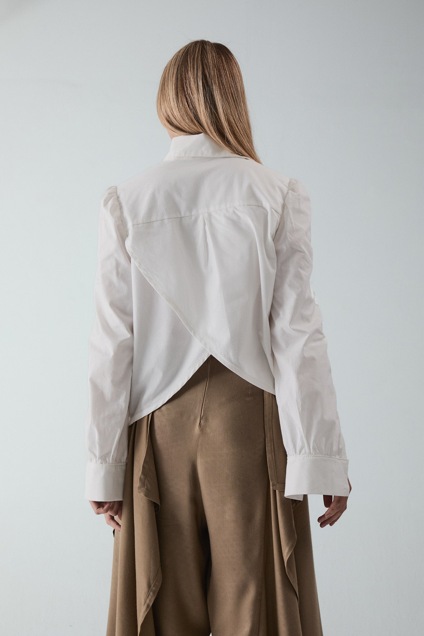 -AT THE BACK, A YOKE WITH A CENTRAL PLEAT AND TWO OVERLAPPING CURVED PIECES SUBTLY REVEAL THE SKIN