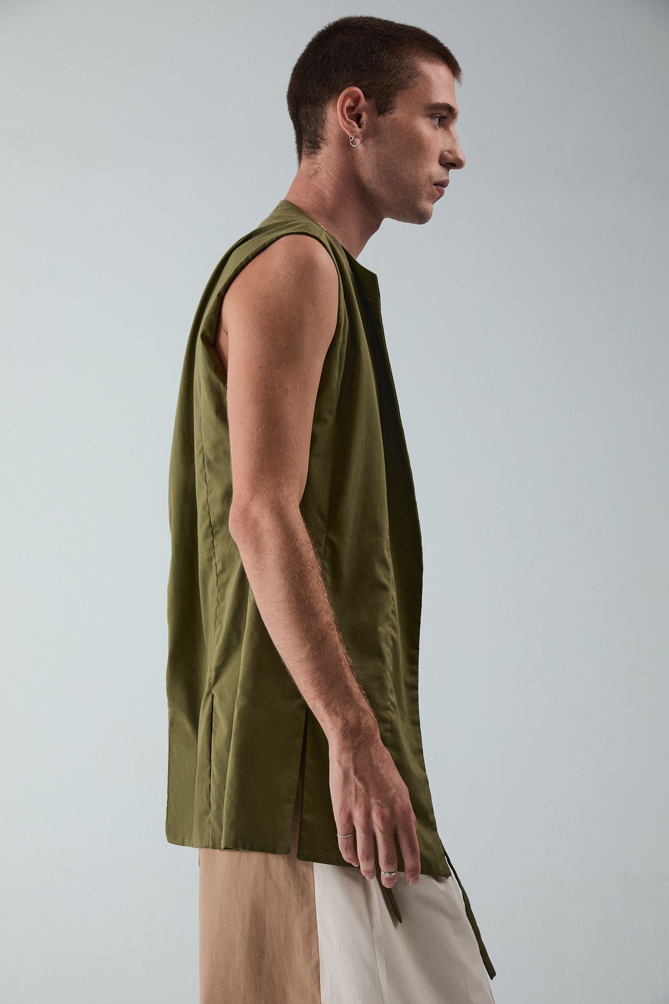 THIS ASYMMETRICAL BICOLOR VEST FEATURES A WIDER ARMHOLE OPENING FOR ADDED COMFORT. THE COLLAR, SPLIT IN THE BACK, CREATES AN INTERESTING VISUAL EFFECT OF TWO GARMENTS IN ONE. THE FRONT TIE ADDS TEXTURE WITH FOLDS WHEN CLOSED, WHILE ANOTHER DECORATIVE TIE AT THE BOTTOM AND ONE AT THE BACK HELP TAILOR THE FIT TO THE SILHOUETTE.