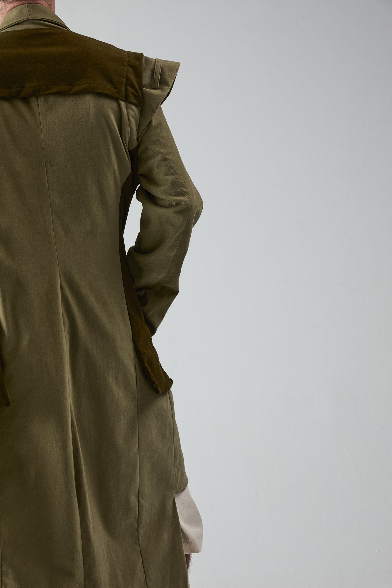 OUR LONG TRENCH COAT PLAYS WITH VOLUME THROUGH ITS LARGE SHOULDER PADS AND CUTS THAT EVOKE THE LOOK OF AN OVERLAID VEST.