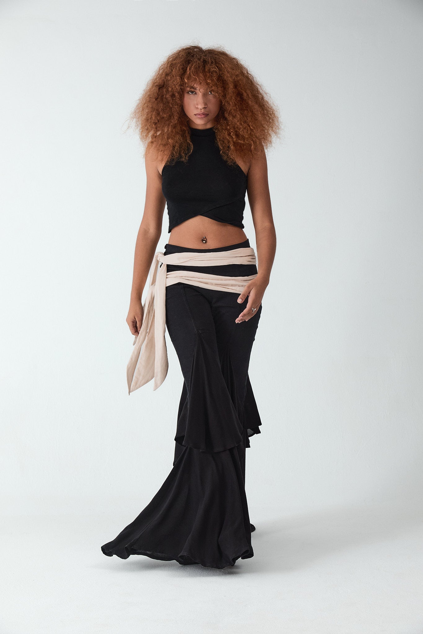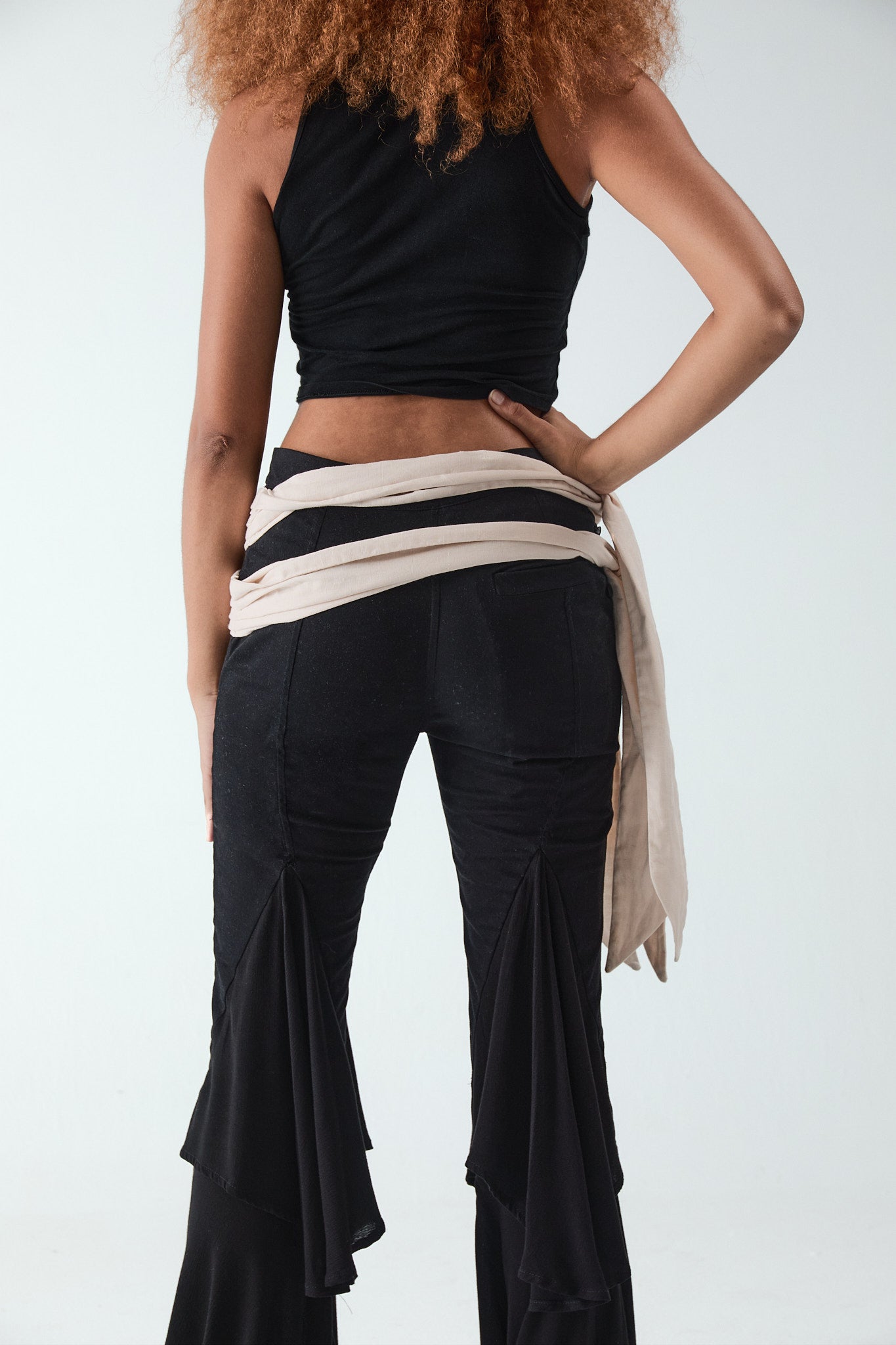 THESE FITTED PANTS WITH RUFFLES AT VARIOUS HEIGHTS ARE A GEM FOR THE MODERN WARDROBE