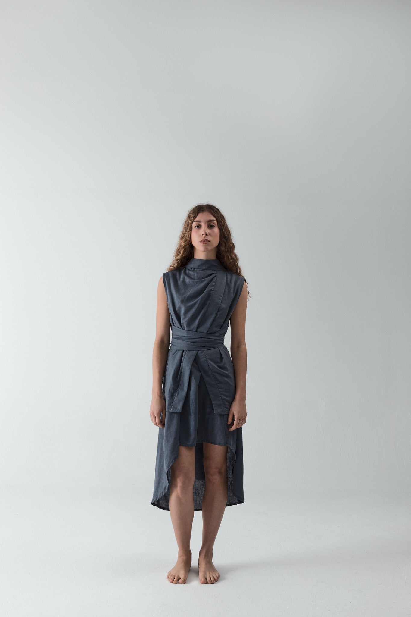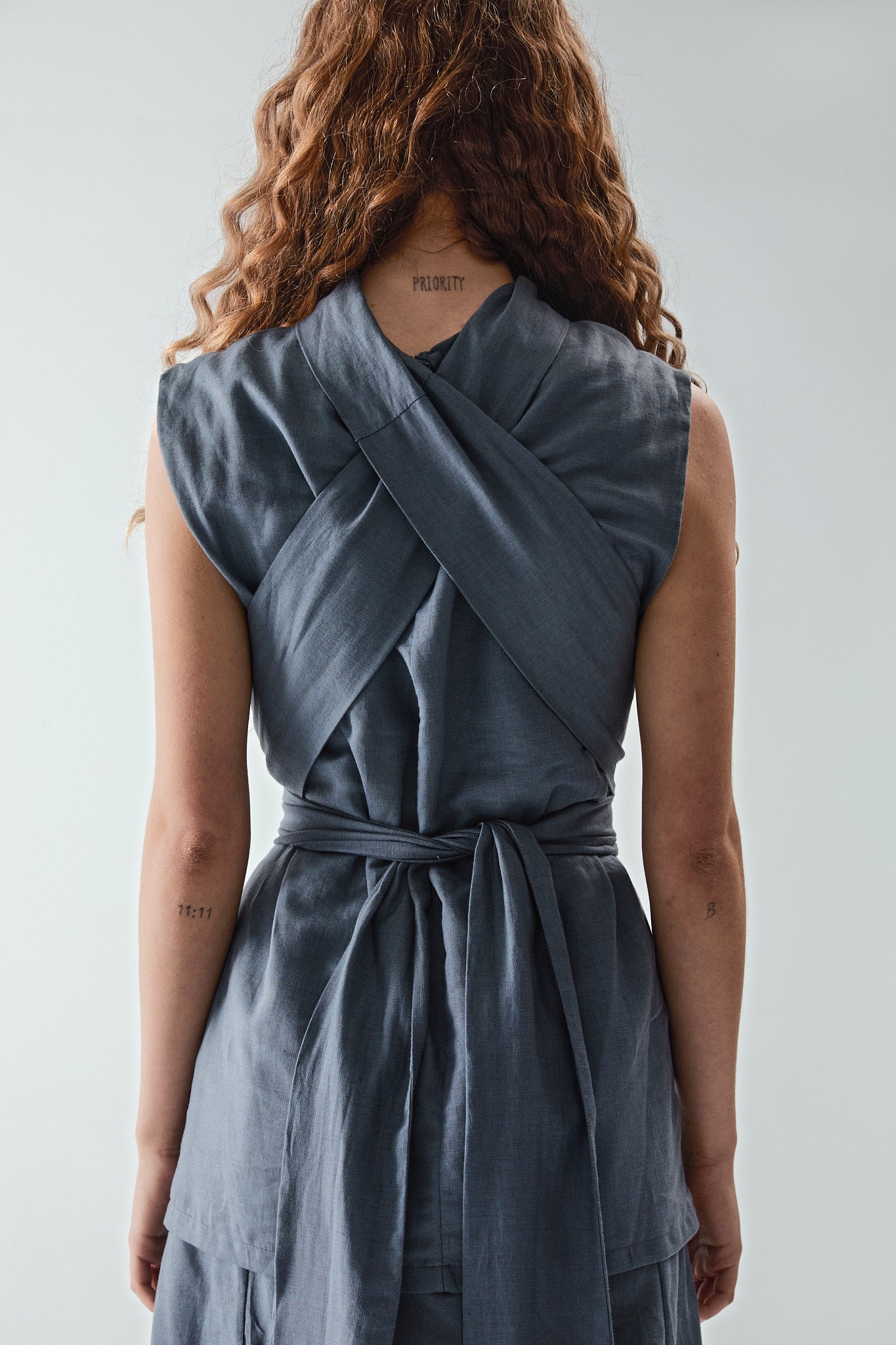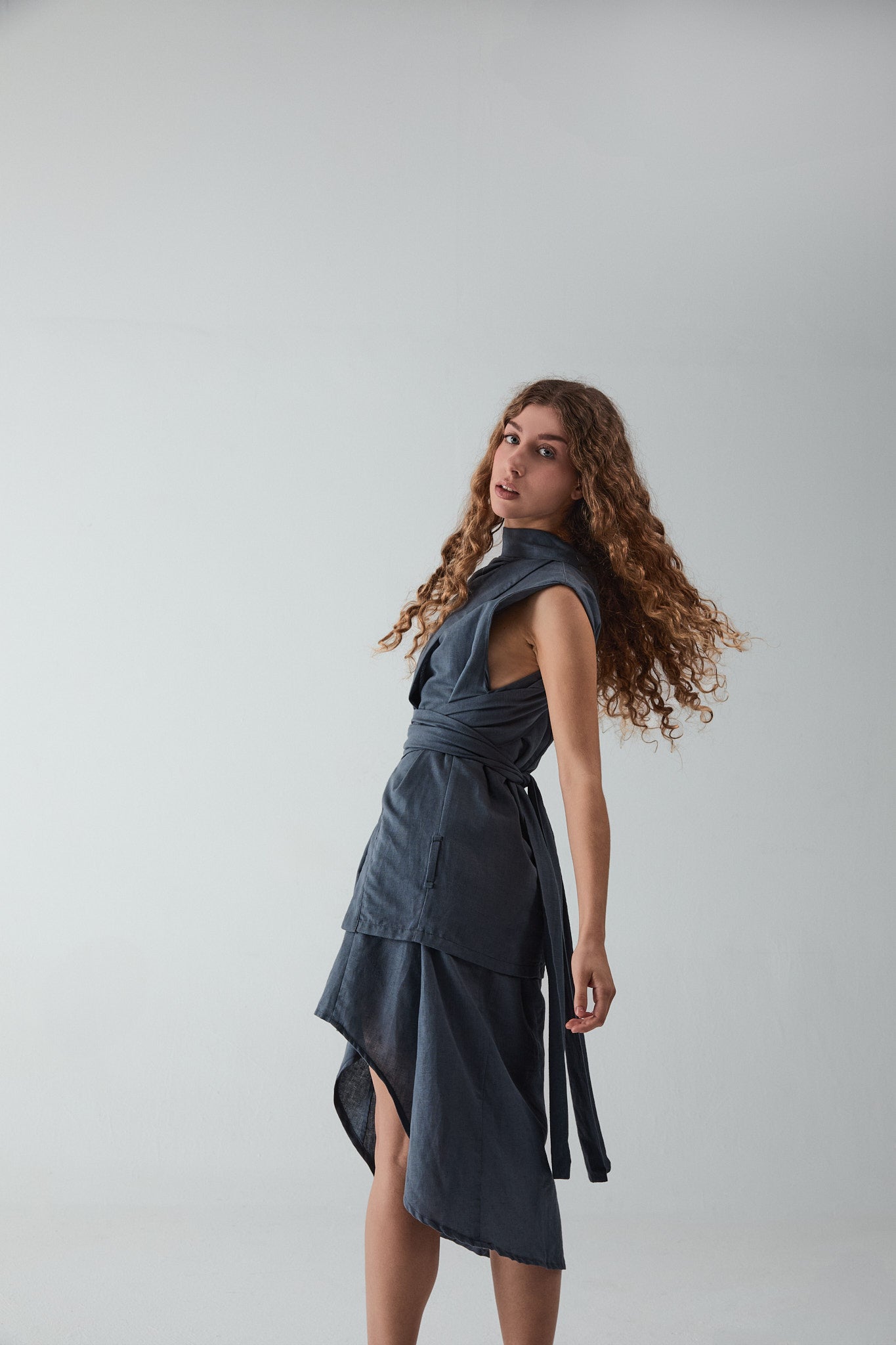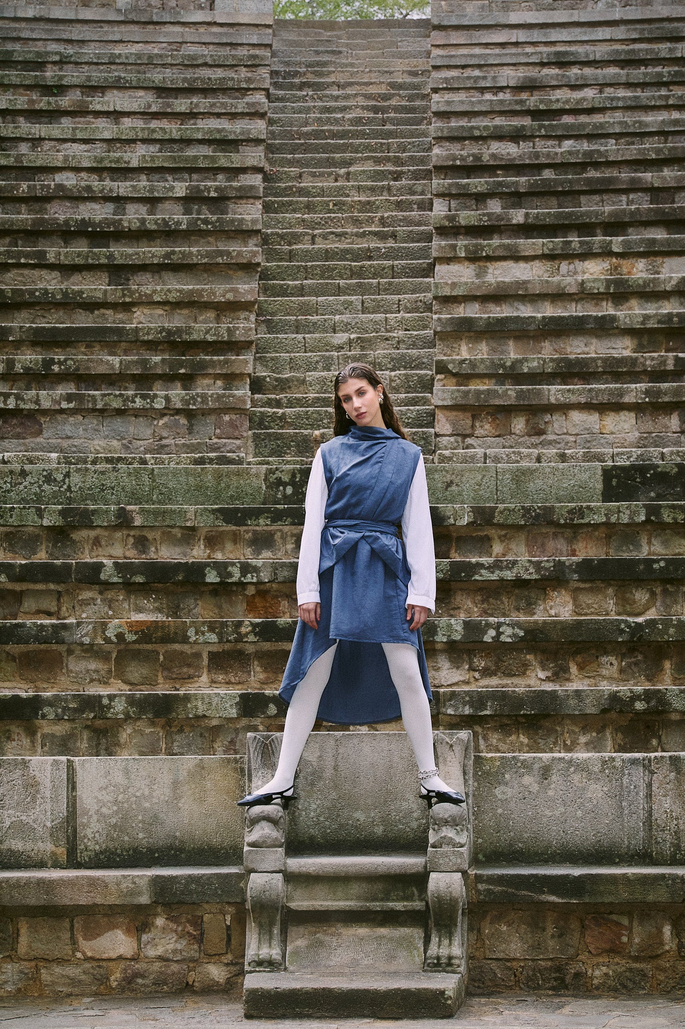 THIS SLEEVELESS DRESS FEATURES OVERLAPPING LAYERS THAT CREATE A FLUID MOVEMENT. THE NECK IS CLOSED WITH FABRIC TIES AT THE BACK, ADDING A UNIQUE TOUCH, WHILE AN UPPER LAYER THAT LOOKS LIKE A SHIRT IS SEAMLESSLY INTEGRATED INTO THE PIECE, CRAFTING A SINGLE GARMENT THAT OFFERS A DYNAMIC LOOK.