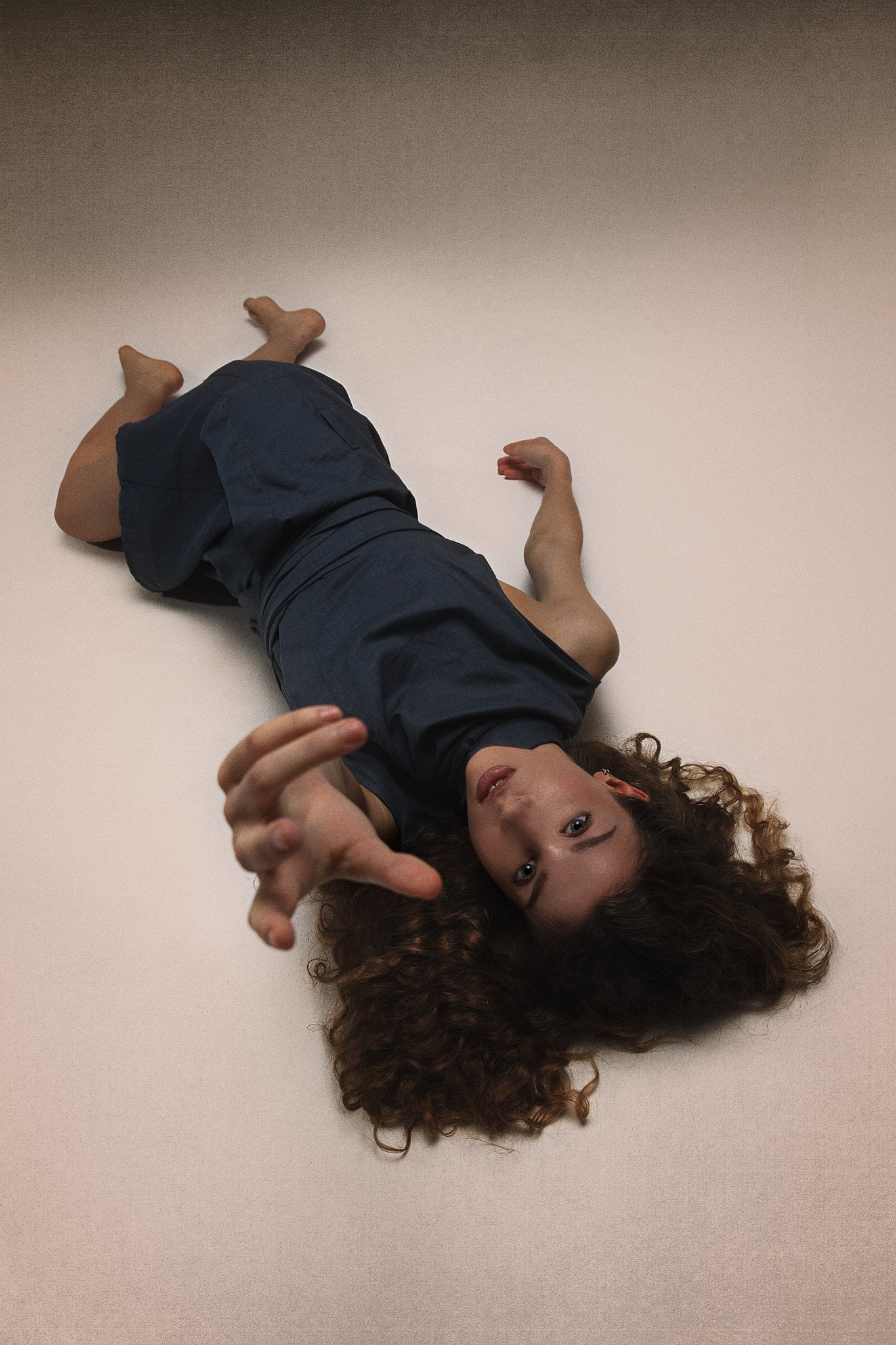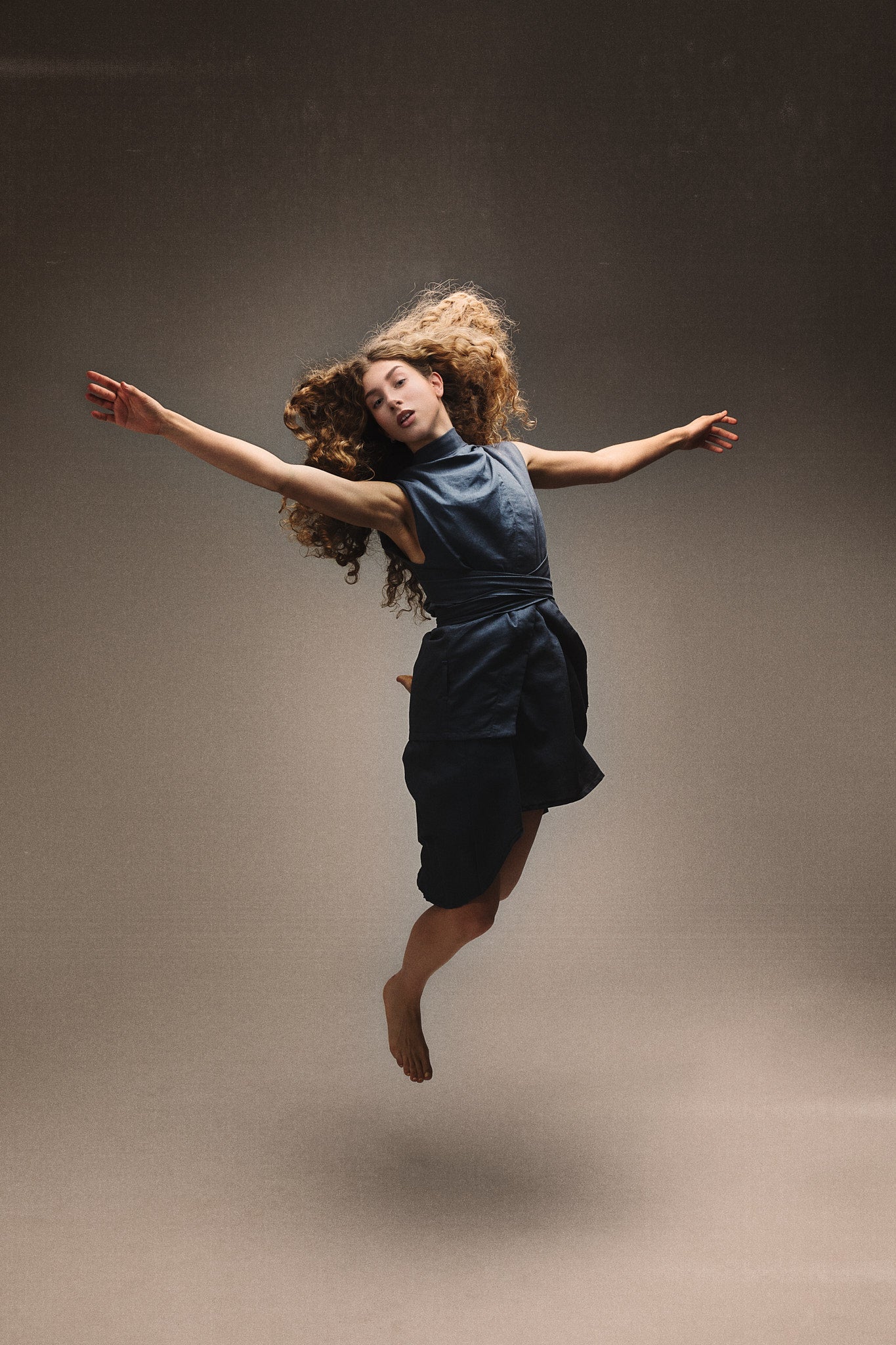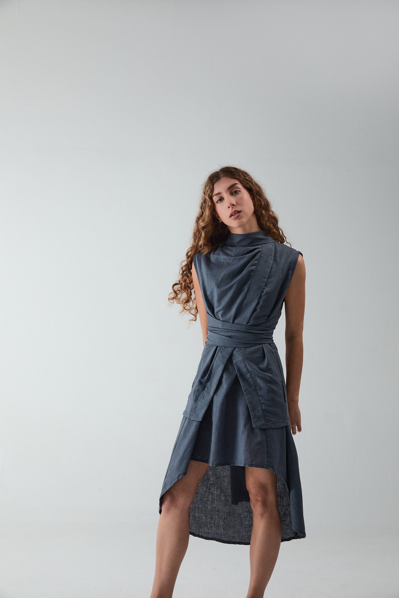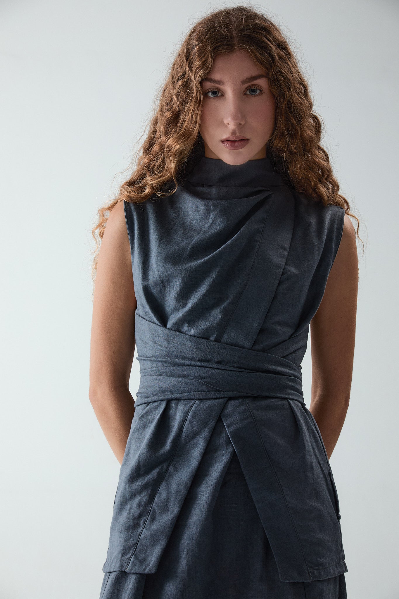 THIS SLEEVELESS DRESS FEATURES OVERLAPPING LAYERS THAT CREATE A FLUID MOVEMENT. THE NECK IS CLOSED WITH FABRIC TIES AT THE BACK, ADDING A UNIQUE TOUCH, WHILE AN UPPER LAYER THAT LOOKS LIKE A SHIRT IS SEAMLESSLY INTEGRATED INTO THE PIECE, CRAFTING A SINGLE GARMENT THAT OFFERS A DYNAMIC LOOK.