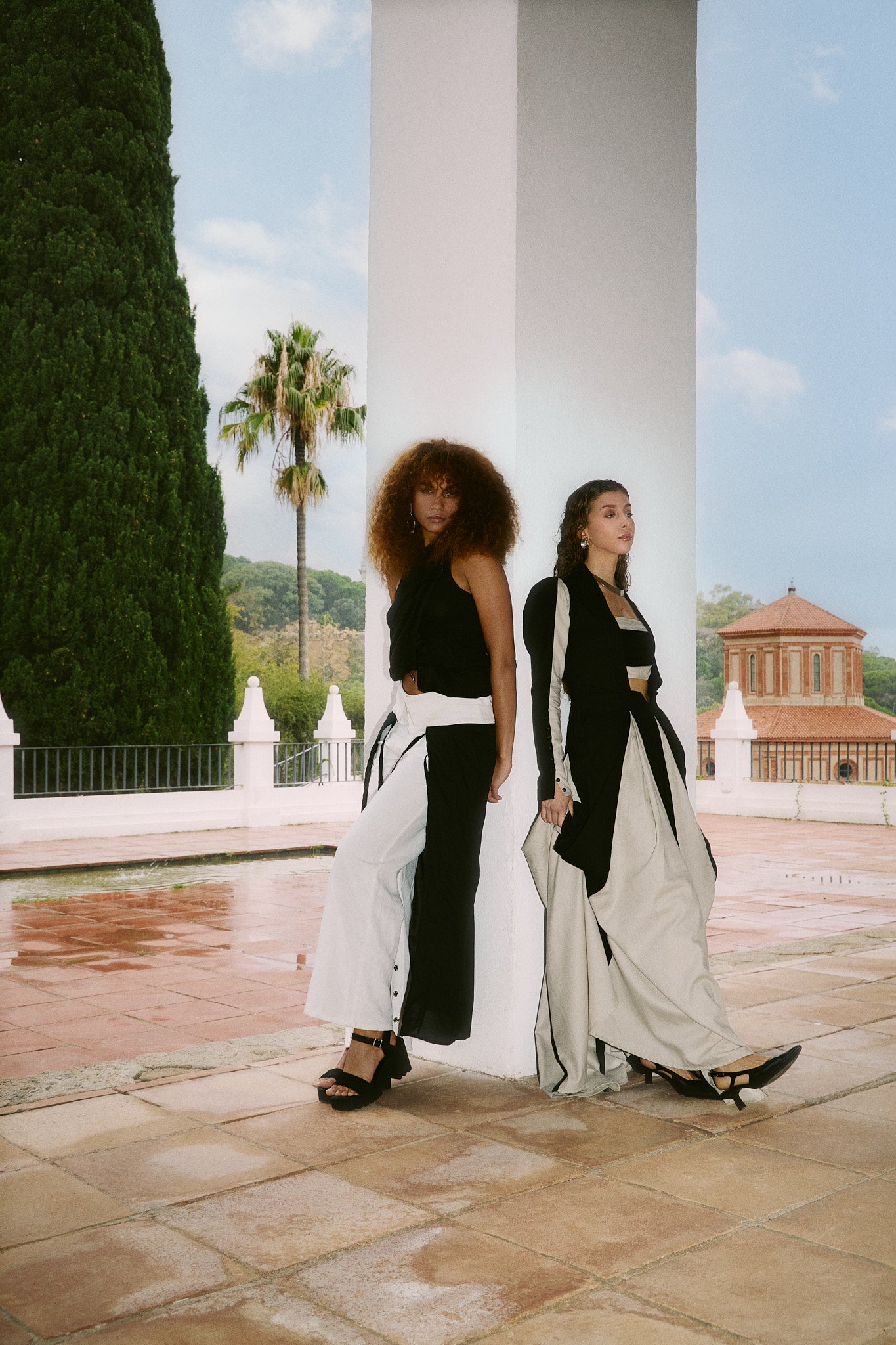 MADE OUT OF 56% ORGANIC COTTON CERTIFIED BY BCI (BETTER COTTON INITIATIVE) AND 44% LINEN FIBERS CERTIFIED BY EUROPEAN FLAX. THE OVERSKIRT IS MADE OUT OF 100% ORGANIC COTTON CERTIFIED BY GOTS (GLOBAL ORGANIC TEXTILE STANDARD)
